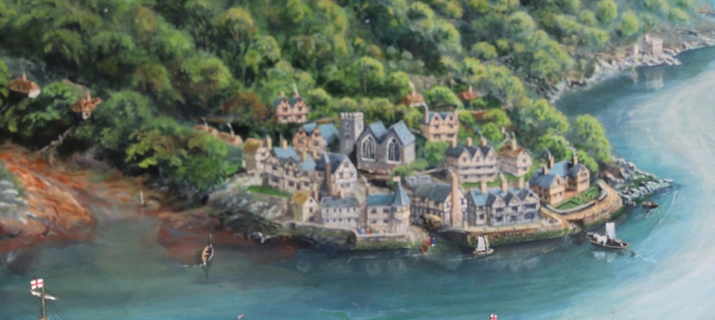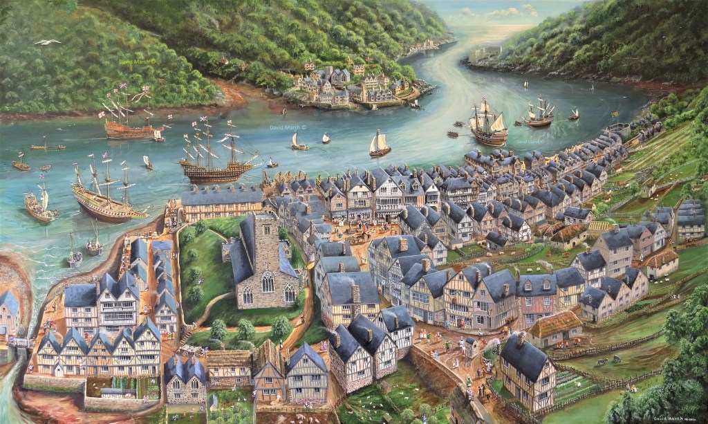 The long estuary of the Dart river provided a natural sheltered deep water harbour with extensive anchorage for many ships. The North Atlantic fish trade helped to make it comparatively wealthy. Just imagine the industry supporting 30-40 ships leaving Dartmouth in the spring each year and returning between September and December with dried and salted fish from Newfoundland, and wines, olives and fruits from Spain!