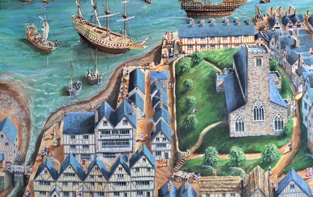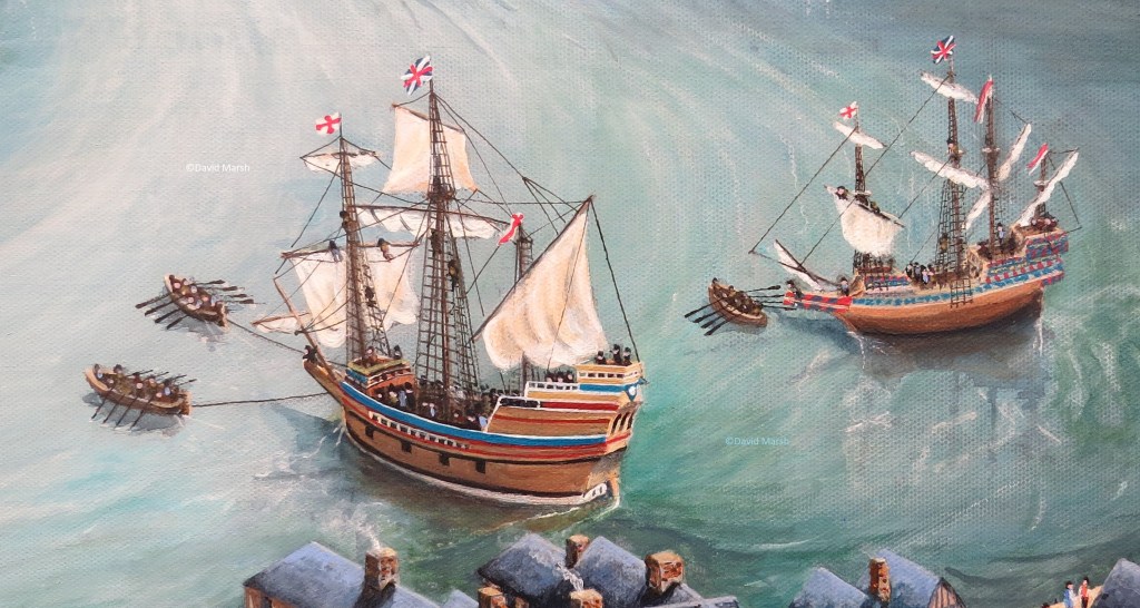My lifelong interest in Dartmouth, Devon, and two unique maps produced in 1619 for a dispute over a right of way, inspired this painting. It aims to depict what life might have been like in August 1620, when the Mayflower and Speedwell departed from the port bound for North America with the Pilgrims who formed the founding colony in New England. The large painting on canvas, “Dartmouth in 1620” is on display alongside the Mayflower Exhibition which opened at the Dartmouth Museum, Butterwalk, on 23 October 2021.