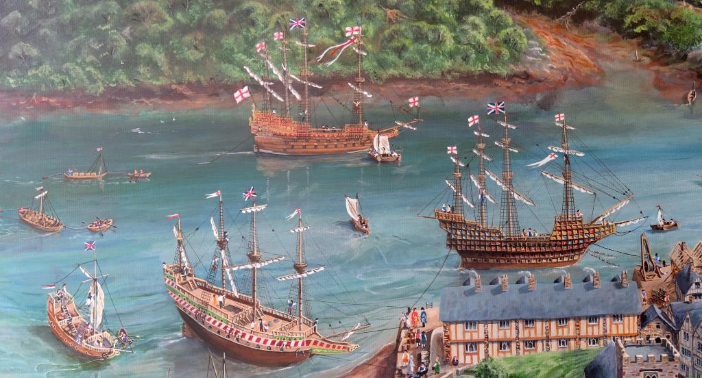 The painting ‘Dartmouth in 1620’ has been donated to the Dartmouth Museum with all other items in the collection relating to the painting and book ‘Life in Dartmouth in 1620’. Any enquiries relating to the images or products for any purpose must be directed to the Museum using the form on their website at: